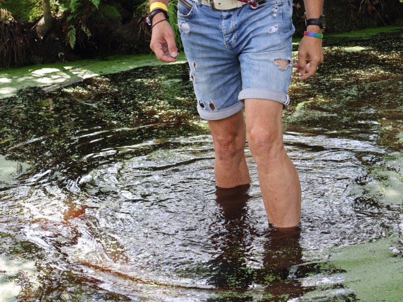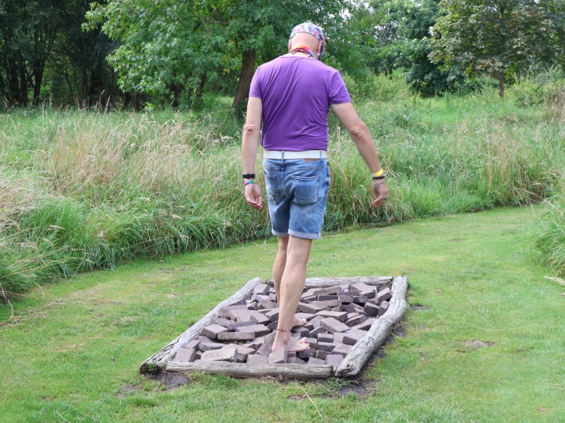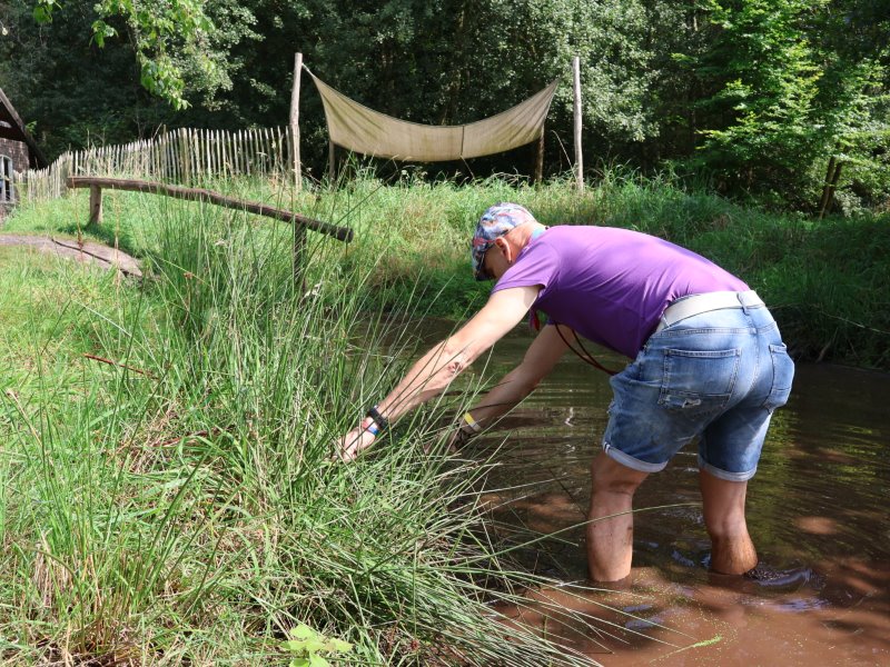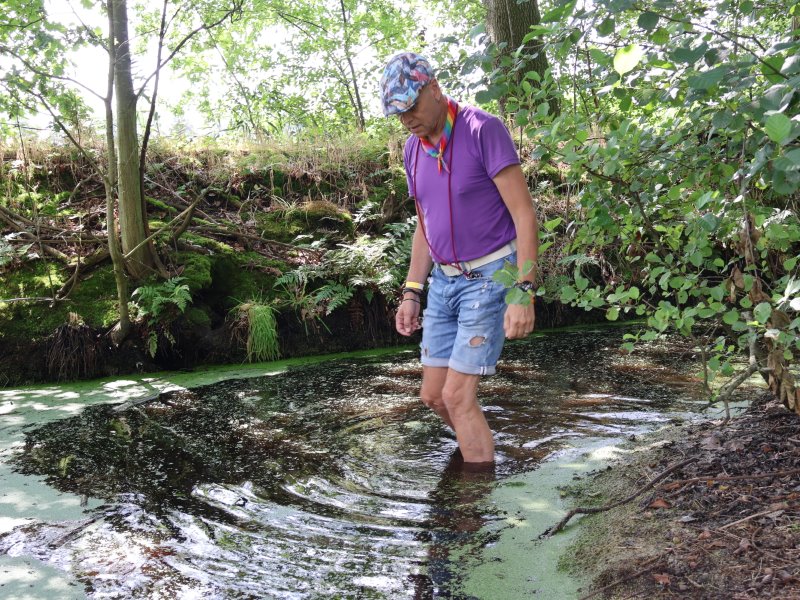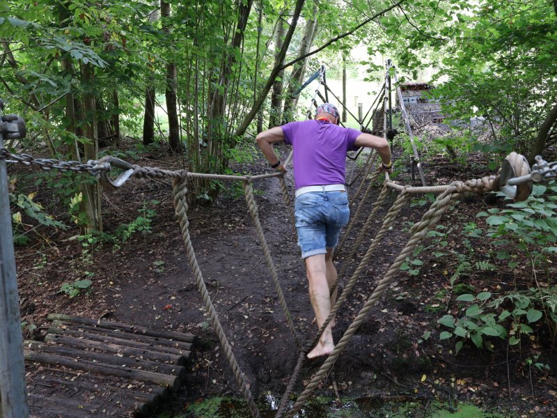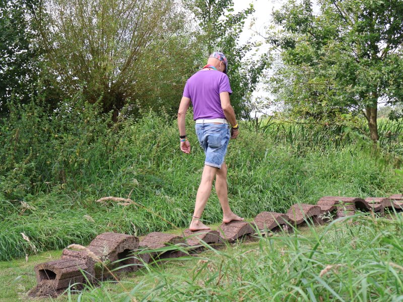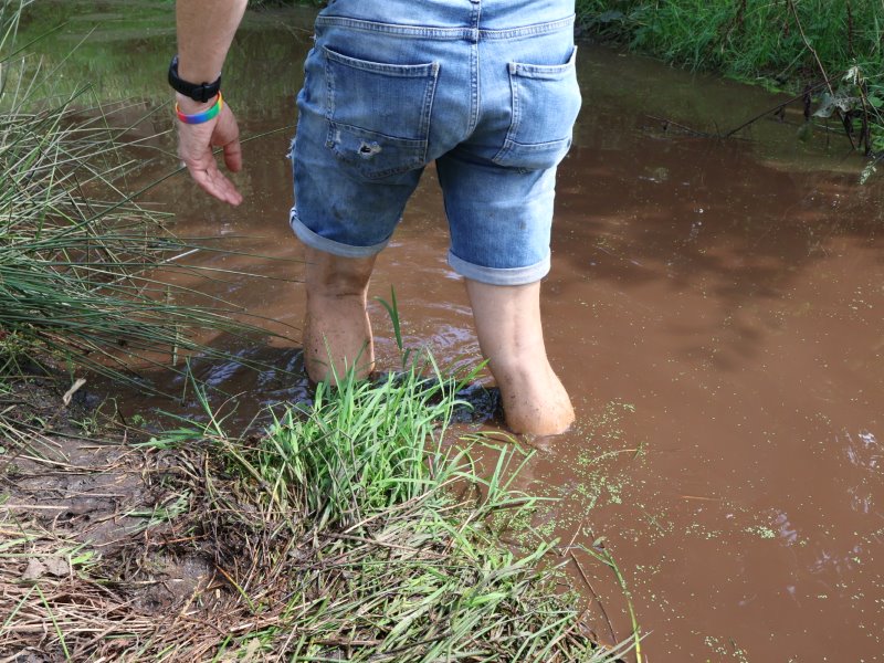 We beginnen met koffie en wat lekkers. Een leuk arrangement samen met het Blotevoetenpad. Daarna krijgen we uitleg over het pad. Eigenlijk zijn het 2 paden: Heintje en Matje. Natuurlijk vernoemd naar de gebroeders Beekman, waar Toon Kortooms een paar boeken over heeft geschreven. Heintje was iets braver dan Matje, dus paden zijn dus ook zo opgedeeld. Heintje slaat de avontuurlijke obstakels over. Dat zijn wij dus niet van plan: we willen het natuurlijk allemaal beleven! Sommige obstakels waren echt wel uitdagend. Door het vele kroos of het modderige water zie je niet waar je je voeten neer moet zetten. Door de peelgrond, klei, is het overal lekker glibberig. Maar we hebben alles gedaan, modderige benen, kroos tussen de tenen en klei op de broeken. Na ongeveer vijf kwartier zijn we terug bij het schuurtje waar we onze schoenen hebben achtergelaten. Daar wassen we onze voeten en gaan weer het terras op.