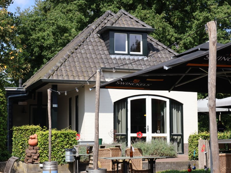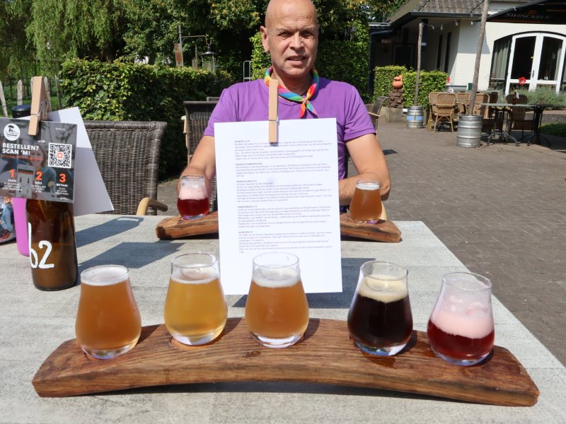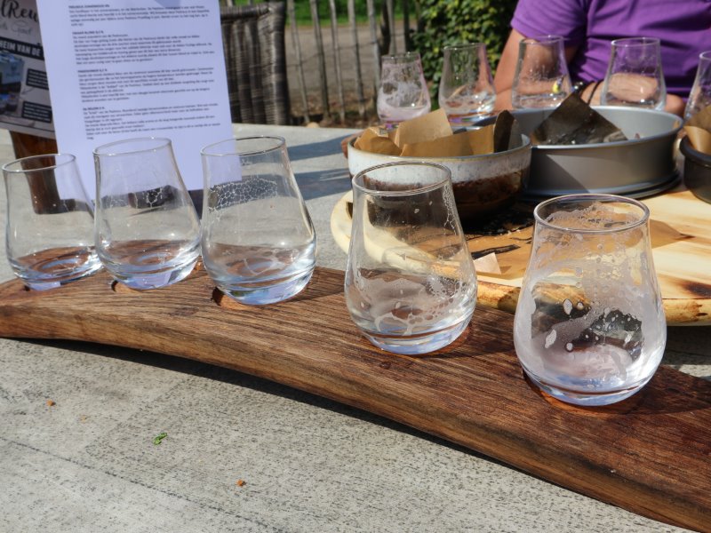 Op het terras krijgen we een proeverij van 5 biertjes. Het merk Peelreus is een plaatselijk initiatief. De biertjes smaken goed en de proefglaasjes zijn van een leuk formaatje. Natuurlijk beoordelen we elk biertje op onze Untapped. De chefkok brengt ook nog wat hapjes: 2 bitterballen, 2 garnalenkroketjes, 2 brownies, brood met ham en kaas en nacho’s. ze passen goed bij de biertjes. Als afsluiting neemt Eric nog een gewoon formaat van zijn favoriet, Peelreus Zomergoud, ik tap nog even wat water bij.