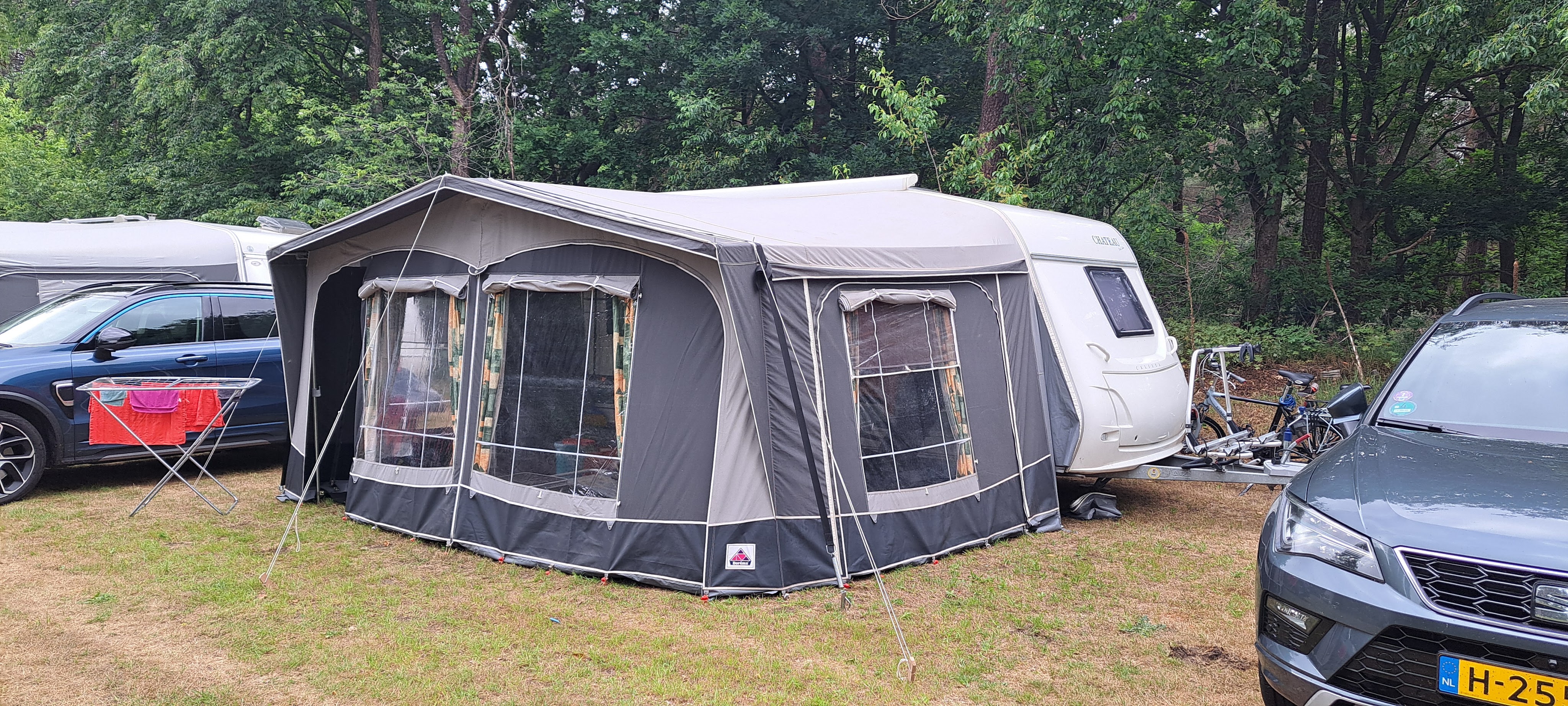 Uitproberen. Alles is nieuw. De voortent is gelukkig best makkelijk op te zetten. Hij is alleen eerder waarschijnlijk nat weggelegd geweest zo te zien aan de weerplekken en de “zak” waar water in heeft gestaan. Beetje jammer, maar voorlopig voldoet hij nog wel. Onze spullen staan droog en als het in de ochtend nog wat koud is zitten we lekker warm te ontbijten.